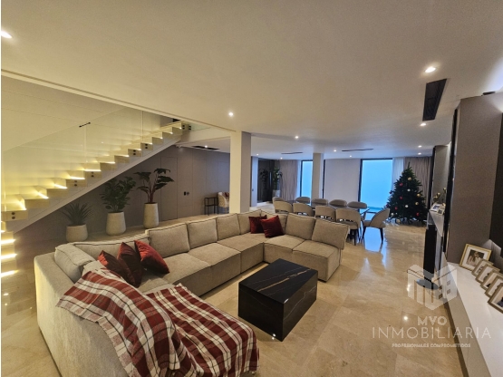 Venta de Casa luxury de 3 niveles con pisos en marmol, acabados modernos, diseño de luces, muebles empotrados, aire central en primer nivel, piscina y zona bbq para la familia. Doble altura.